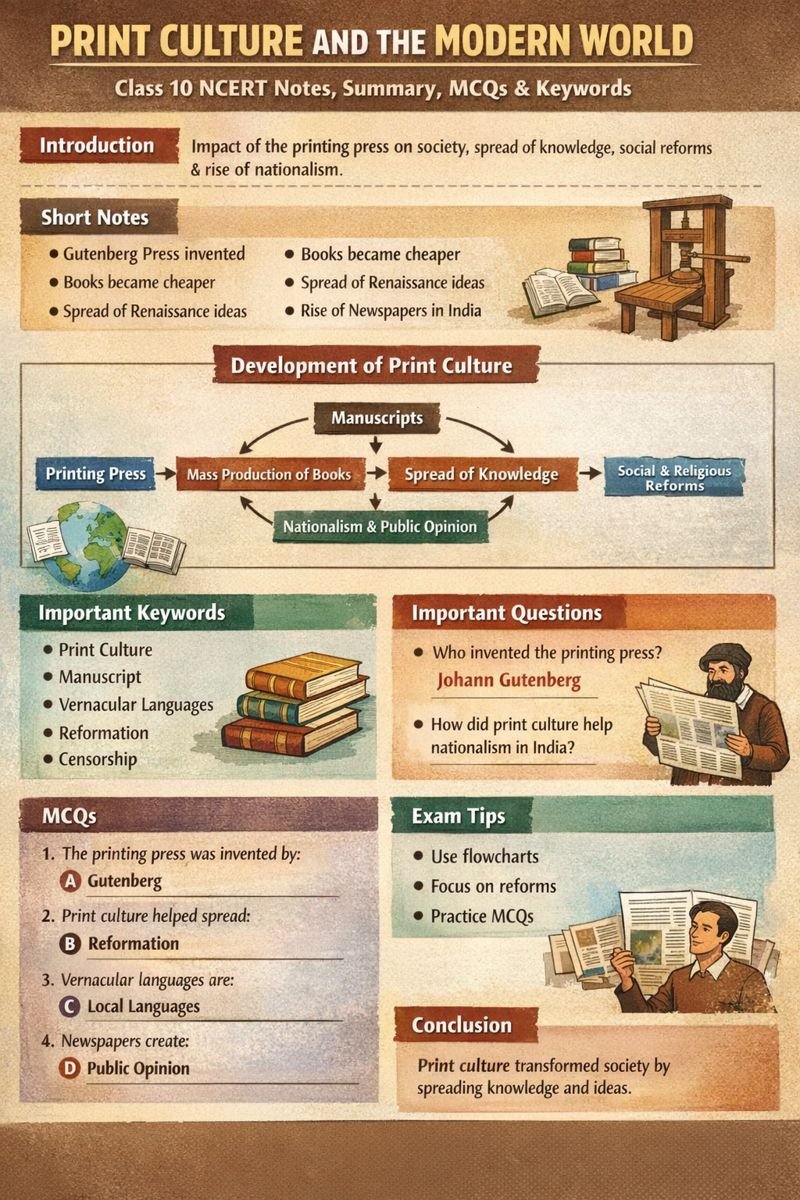 Meta Description (150–160 characters) Print Culture and the Modern World Class 10 notes, summary, MCQs, keywords, questions and answers for…