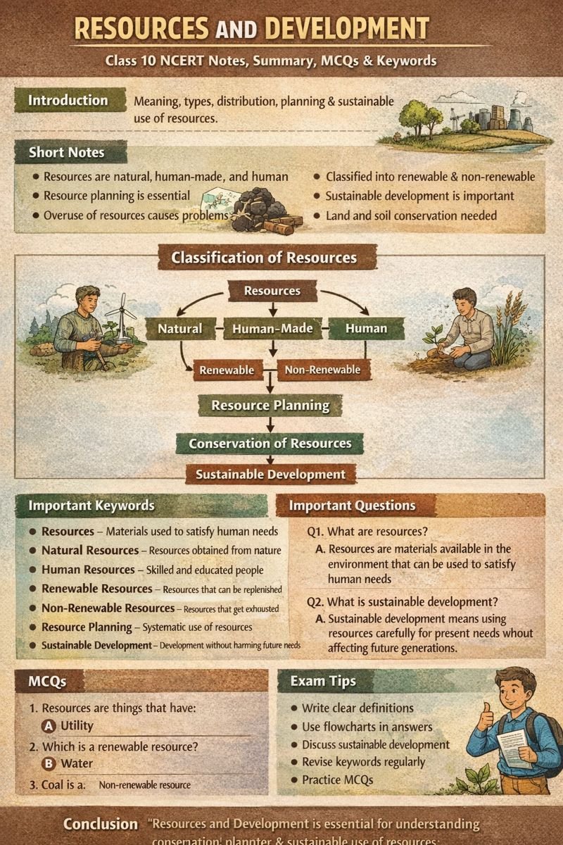 Meta Description (150–160 Characters) Resources and Development Class 10 NCERT notes with summary, keywords, important questions, MCQs and exam tips…