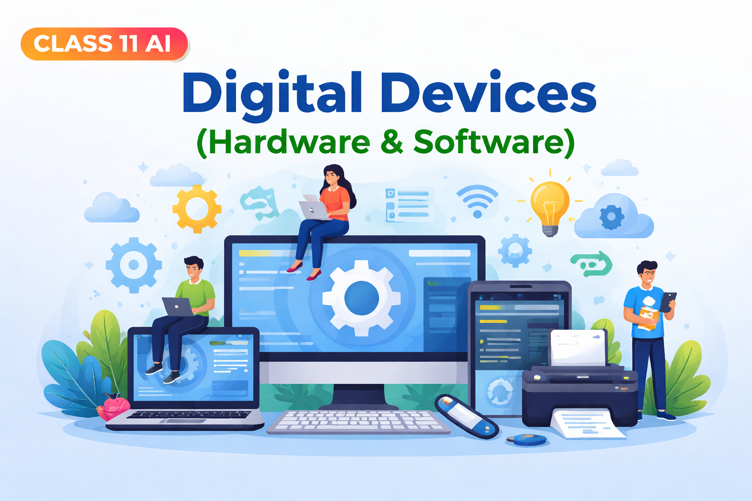Meta Description Comprehensive notes on Digital Devices (Hardware & Software) Class 11 AI including summary, MCQs, keywords, questions, and exam…