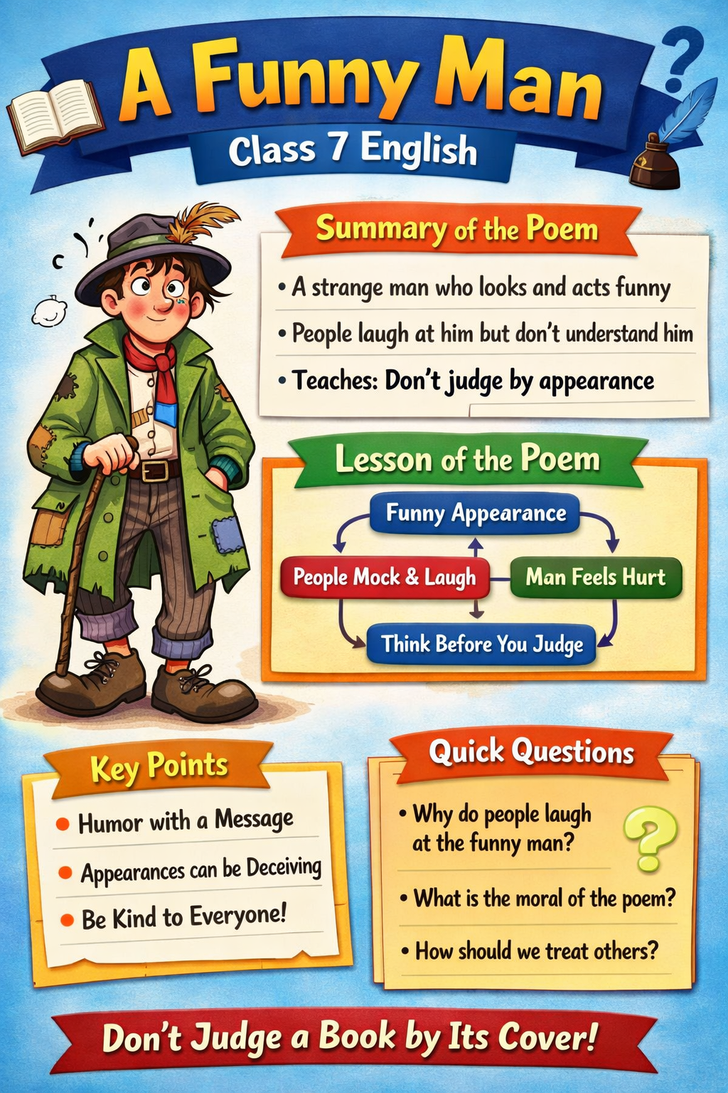 Meta Description (150–160 characters A Funny Man Class 7 English NCERT full chapter solution with summary, notes, MCQs, keywords, questions…